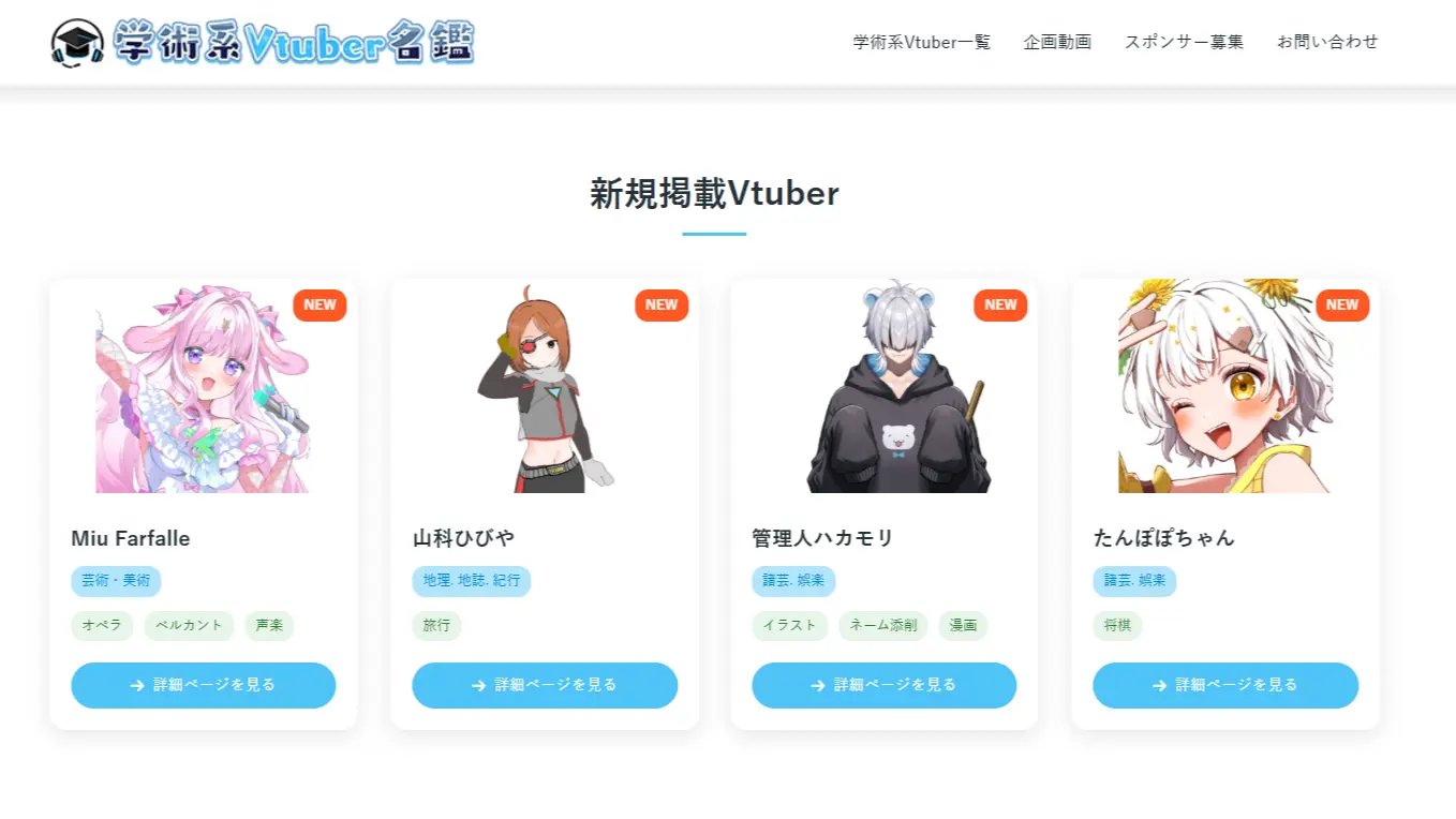 「学術系Vtuber名鑑」は、いわゆるデータベースサイト。ジャンルを問わず、様々な学術系VTuberの情報を集めています。