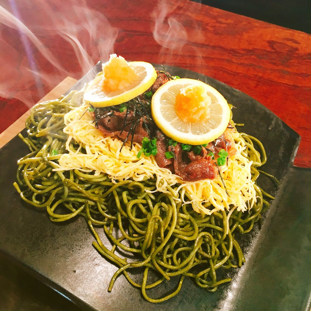 6. 皿に茶蕎麦を盛り、その上に錦糸卵、牛肉、小ねぎ、刻みのり、レモン、紅葉おろしの順に盛り付けます。