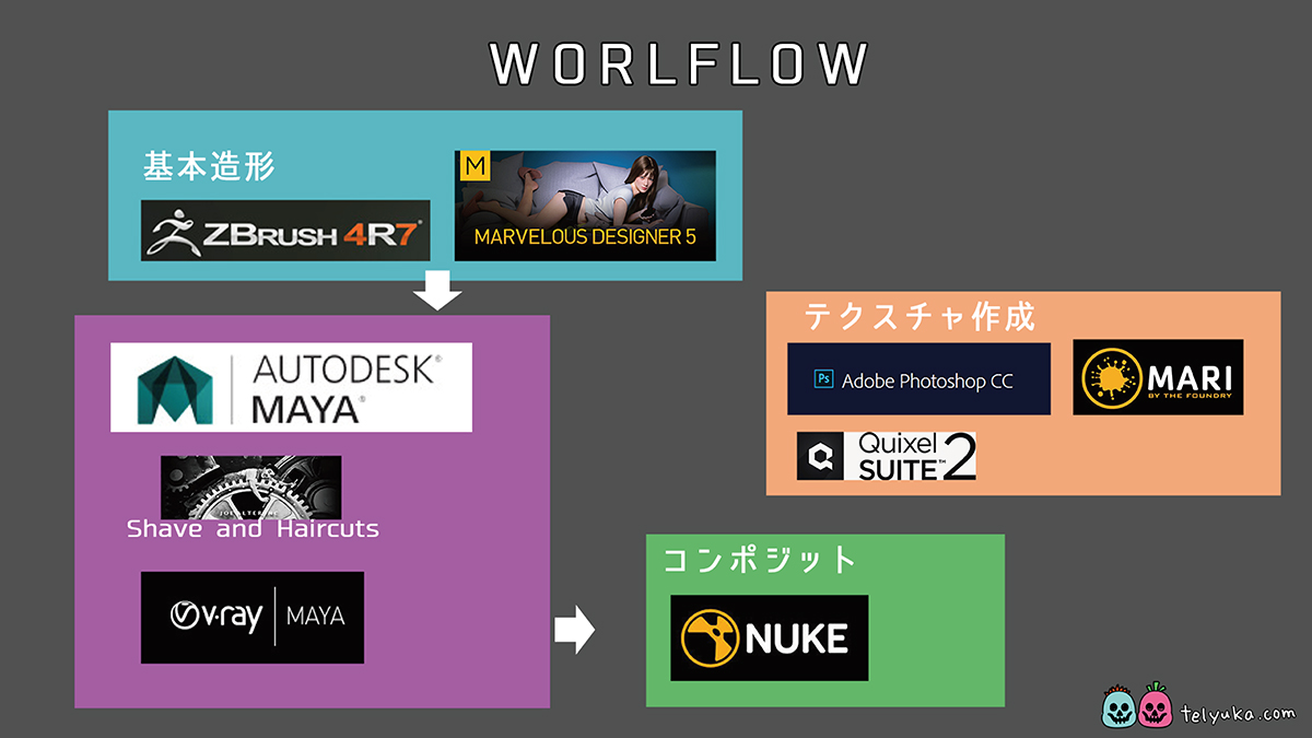 「Maya」「ZBrush」「V-ray」「Mari」「Quixel2.0」「Photoshop」等といった多くのツールが利用されている。